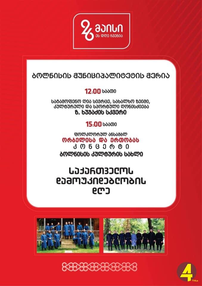 15:00 საათზე -ბოლნისის კულტურის სახლის სცენაზე გაიმართება დასკვნითი კონცერტი ანსამბლ „ორბელისა“ და „ერთობას“ შესრულებით.