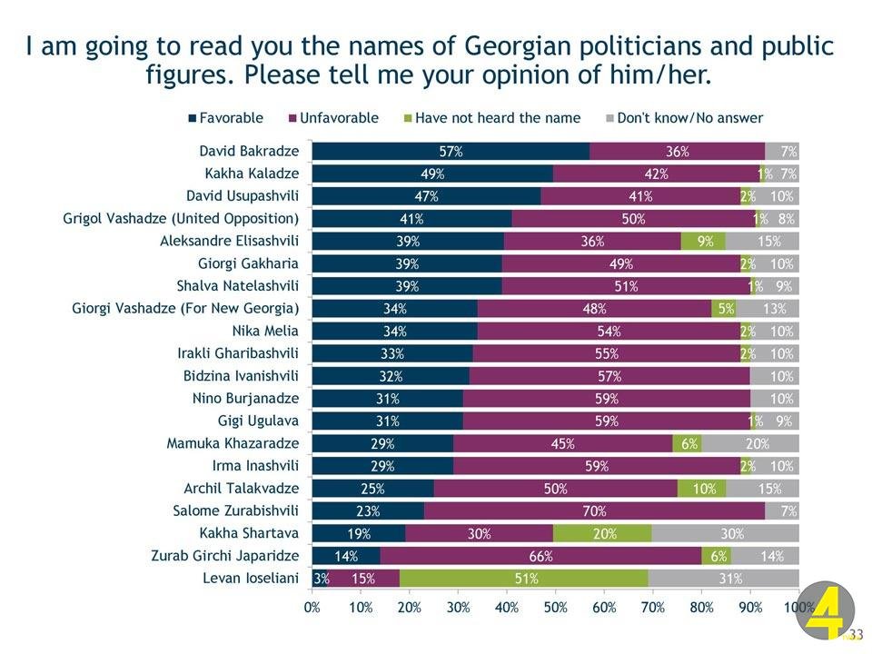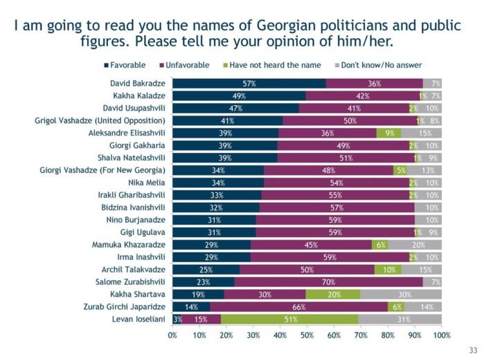საერთაშორისო რესპუბლიკური ინსტიტუტის (IRI) კვლევის მიხედვით: გამოკითხულთა 57 პროცენტის კეთილგანწყობით „ევროპული საქართველოს“ ერთ-ერთი ლიდერი დავით ბაქრაძე სარგებლობს, მეორე ადგილს თბილისის მერი, კახა კალაძე იკავებს – 49 პროცენტით, მესამეზე კი „შენების მოძრაობის“ ლიდერი დავით უსუფაშვილია – 47 პროცენტით.