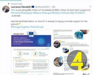 ევროკომისიის სამეზობლოსა და გაფართოების შესახებ მოლაპარაკებების გენერალური დირექტორატის დირექტორი ლოურენს მერედითი „ტვიტერზე“ წერს და შესაბამის ცხრილს აქვეყნებს, რომლის თანახმადაც ევროკავშირი 80 მილიონ ევროს დაუყოვნებლივი საჭიროებებისთვის, ხოლო 883 მილიონ ევროს, მოკლევადიანი მხარდაჭერისთვის გამოყოფს. აღნიშნული თანხიდან 183 მილიონ ევროს საქართველო მიიღებს.