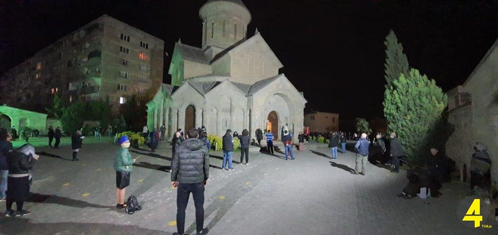 ეკლესიების ეზოებში და შიგნით, მრევლი დისტანციის დაცვით დგას.