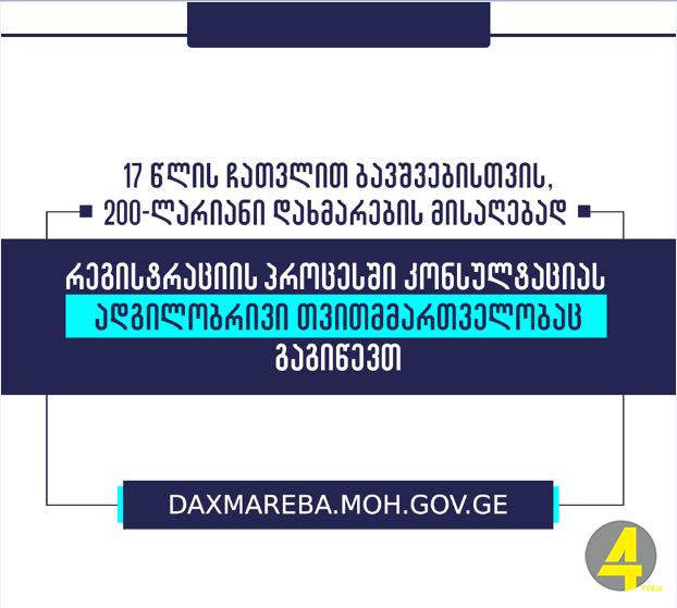 შეგახსენებთ, დახმარება გაიცემა, ბავშვის ერთ-ერთი მშობლის ან კანონიერი წარმომადგენლის მიერ განაცხადის შევსების საფუძველზე. რეგისტრაცია პირველ დეკემბრამდე გაგრძელდება. დახმარების გაცემა დაიწყება მიმდინარე წლის სექტემბრიდან.