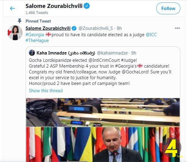 საქართველოს პრეზიდენტი სალომე ზურაბიშვილი გოჩა ლორთქიფანიძის ჰააგის სასამართლოს მოსამართლედ არჩევას „ტვიტერის“ საშუალებით ეხმაურება.