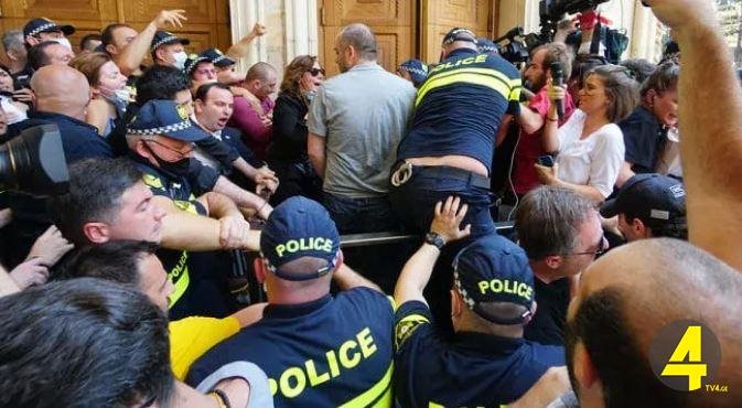 საკანონმდებლო ორგანოს შესასვლელთან ხმაურია- მედიის წარმომადგენლები პარლამენტში შესვლას ცდილობენ, რის შესაძლებლობასაც მათ სამართალდამცველები არ აძლევენ.