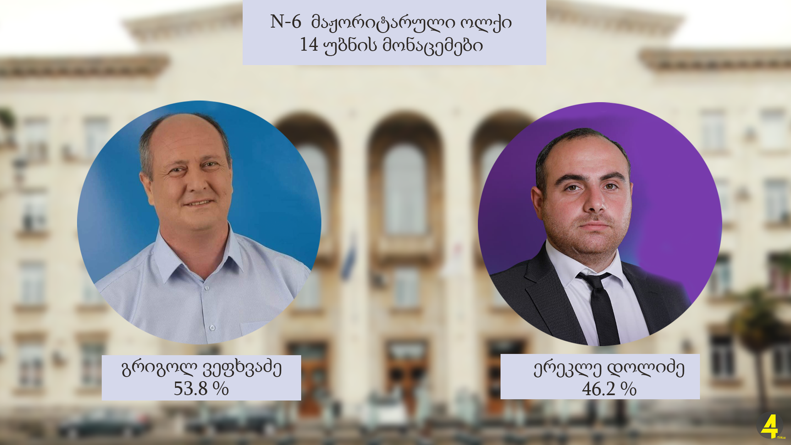 ცესკოს წინასწარი მონაცემების თანახმად, მეექვსე მაჟორიტარულ ოლქში არსებული 14 უბნის მონაცემებით, არჩევნების მეორე ტურში “ქართული ოცნების” კანდიდატმა, გრიგოლ ვეფხვაძემ გაიმარჯვა. შესაბამისად, რუსთავის საკრებულოში მანდატების რაოდენობა იცვლება და წინასწარი მონაცემით, “ქართული ოცნება” და ენმ წარმომადგენლობით ორგანოში თანაბარი მანდატებით იქნებიან წარმოდგენილი.