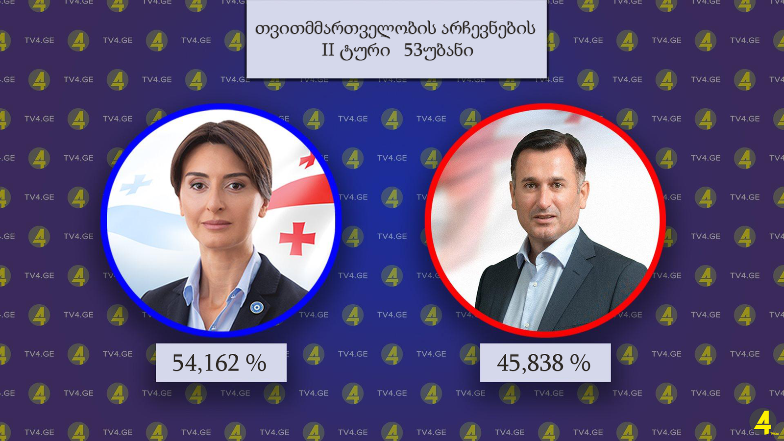 53 უბნის მონაცემების მიხედვით, არჩევნების მე-2 ტურში “ქართული ოცნების” მერობის კანდიდატი, ნინო ლაცაბიძე ლიდერობს, რომელმაც ამ უბნებზე მისული ამომრჩევლების ხმების 54,2%-ის მხარდაჭერა მიიღო, დავით კირკიტაძეს ხმა 45,8%-მა მისცა.