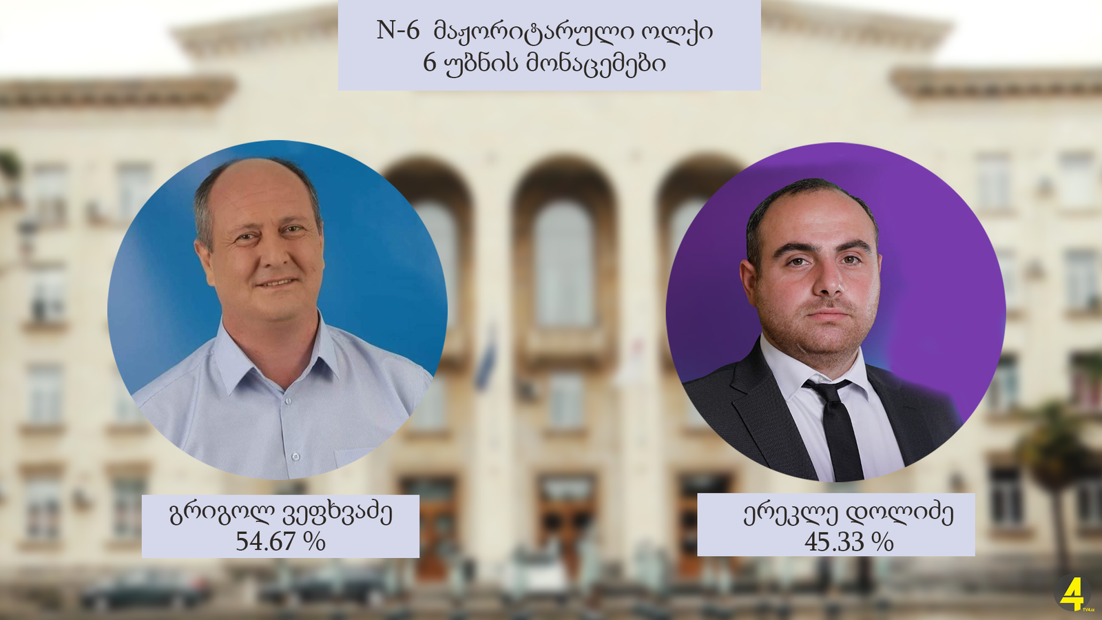 რუსთავში ექვსი უბნის მონაცემების მიხედვით, მე-6 სამაჟორიტარო ოლქში, სადაც არჩევნების მეორე ტური ჩატარდა, “ქართული ოცნების” საკრებულოს წევრობის კანდიდატი ლიდერობს. გრიგოლ ვეფხვაძემ ოთხი უბნის მონაცემებით, ხმების 54.67% მიიღო, პარტია “გახარია- საქართველოსთვის” კანდიდატმა, ერეკლე დოლიძემ კი 45.33%-ის მხარდაჭერა მოიპოვა.