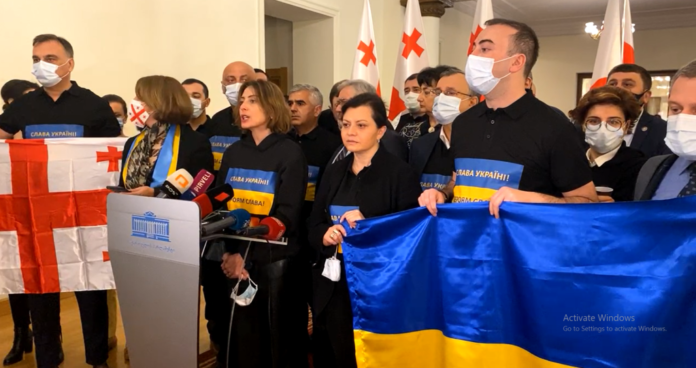 პარლამენტის ოპოზიციონერმა დეპუტატებმა უკრაინის მხარდამჭერი ჰიმნი შეასრულეს, უკრაინის სახელმწიფო ჰიმნის შემდეგ კი გააჟღერეს საქართველოს სახელმწიფო ჰიმნი. პარლამენტის ფოიეში გაშლილია უკრაინისა და საქართველოს სახელმწიფო დროშები.