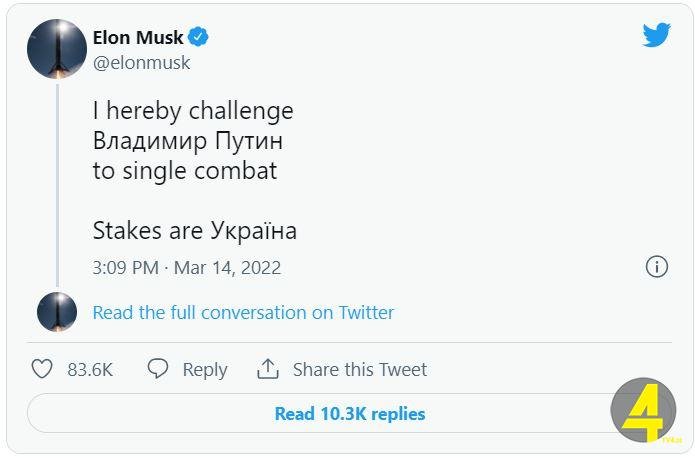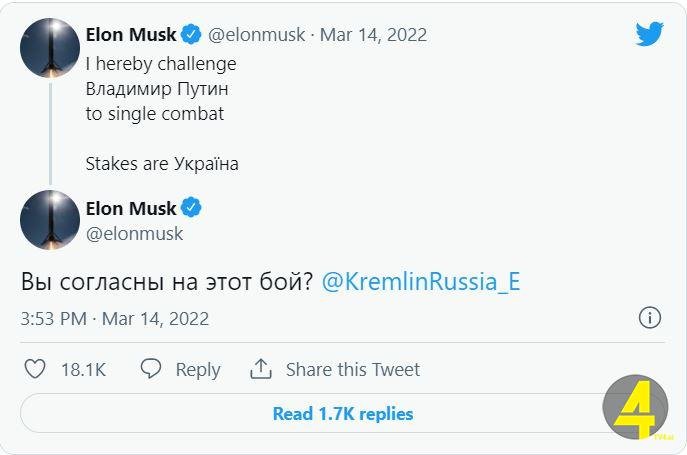 „თანახმა ხართ ამ ბრძოლაზე?“ – რამდენიმე წუთის შემდეგ, მასკმა კიდევ ერთი ტვიტი ამჯერად რუსულ ენაზე დაწერა და კრემლის გვერდი მონიშნა.