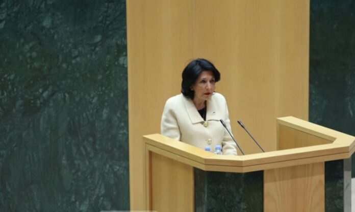 საქართველოს პარლამენტში პრეზიდენტის, სალომე ზურაბიშვილის წლიური მოხსენება წუთიერი დუმილით და უკრაინის ჰიმნით დაიწყო. სხდომის დაწყებამდე პრეზიდენტმა და პარლამენტის თავმჯდომარემ უკრაინელი ხალხის მიმართ სოლიდარობა გამოხატეს. პარლამენტში სალომე ზურაბიშვილი უკრაინის საელჩოს წარმომადგენელთან, ანდრეი კასანოვთან ერთად მივიდა.