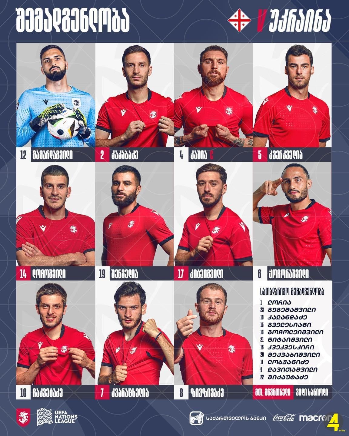 უკრაინასთან მატჩისთვის საქართველოს ეროვნული ნაკრების შემადგენლობა ცნობილია.