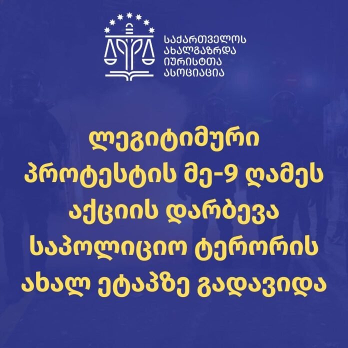 ლეგიტიმური პროტესტის მე-9 ღამეს აქციის დარბევა საპოლიციო ტერორის ახალ ეტაპზე გადავიდა. მთელი ღამის განმავლობაში გრძელდებოდა შსს-ს მიერ ძალადობრივი მეთოდების გამოყენება: ფიზიკური ანგარიშსწორება, მშვიდობიანი აქციის მონაწილეთა მიმართ მუქარა და გინება, ძალადობრივი უკანონო დაკავება, ჟურნალისტურ საქმიანობაში ხელშეშლა, ასევე, ფიზიკურ პირთა დაჯგუფებების ჩართულობა აქციის მონაწილეთა წინააღმდეგ,- ამის შესახებ „საქართველოს ახალგაზრდა იურისტთა ასოციაციას“ მიერ გავრცელებულ ინფორმაციაშია ნათქვამი.