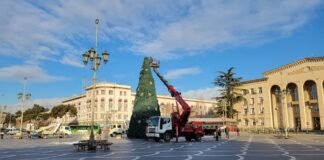 რუსთავში მთავარი ნაძვის ხის დემონტაჟი მიმდინარეობს